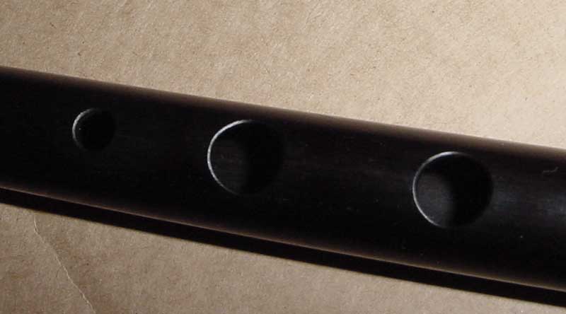 Hole size and placement: The holes are centered, well-rounded, and evenly spaced along the whistle. Because of this spacing, the E hole is a little larger than average, and the D hole also looks a little large-ish. The holes aren’t huge or anything, just about the size of a Susato or Overton, rather than a Burke. The holes aren’t machine-perfect round, but the signs of working are very slight.