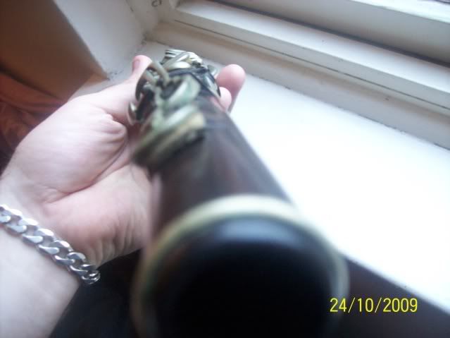 Tape everywhere covering holes where keys once where & tape round the barrel most prob hidding cracks, Slide has stuck solid & there is a crack running the length of the headjoint. The poor thing is covered in dust, dirt and cobwebs and all the pads have rotted away.