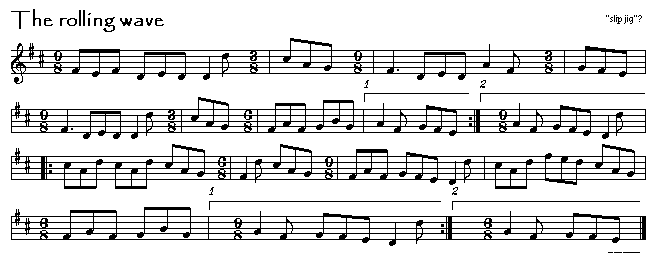 The Rolling Wave. It seems that Willie called this a slip jig (9/8 time) as a compromise, because its time-signature changes from 6/8 to 9/8 and to 3/8 unpredictably and it has me baffled too. One thing I am sure of, though: this is exactly how his father played it, for Willie was a purist in the sense that he held the old people’s tunes sacrosanct, especially those of his father.