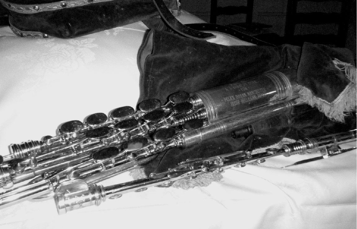 Felix had a set made by Rowsome with silver metalwork with “Felix Doran” engraved in the mainstock. He got somebody to cover the regs in silver. That is the set that Alphie Mulligan has the regs and mainstock from. Neilidh was playing it many years ago on a Comhaltas tour when he showed me the set. The drones from the set appear to be paired up with the chanter and regulators made by Gorker the German engineer. This set was probably put together on a Kennedy mainstock. Dave Williams did a bit of research after visiting Felix’s widow to trace Gorker and wrote up an article for An Piobaire. See vol 2- 26 (July 1985).