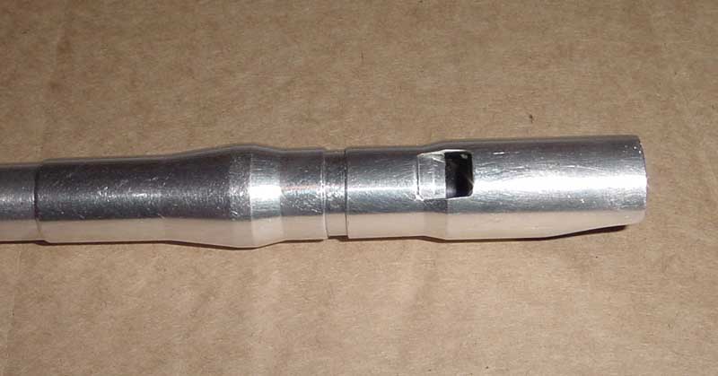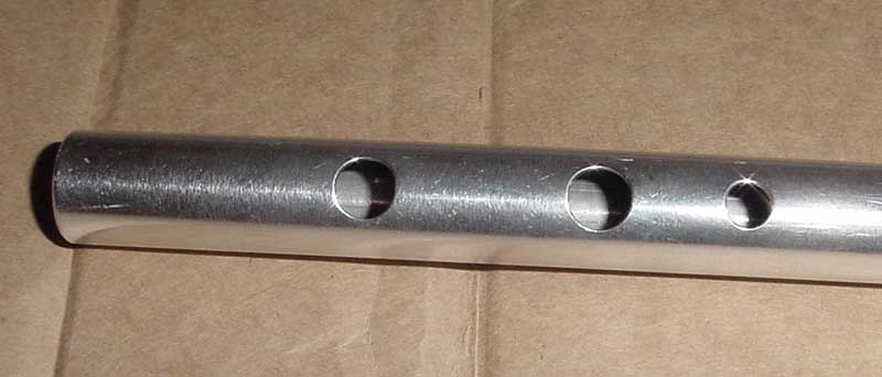 A shot at the end of the whistle, showing the last three holes. All of the holes on Mikes whistles are precicely centered, well rounded, and very slightly chamfered. They’re quite comfortable in the hand.