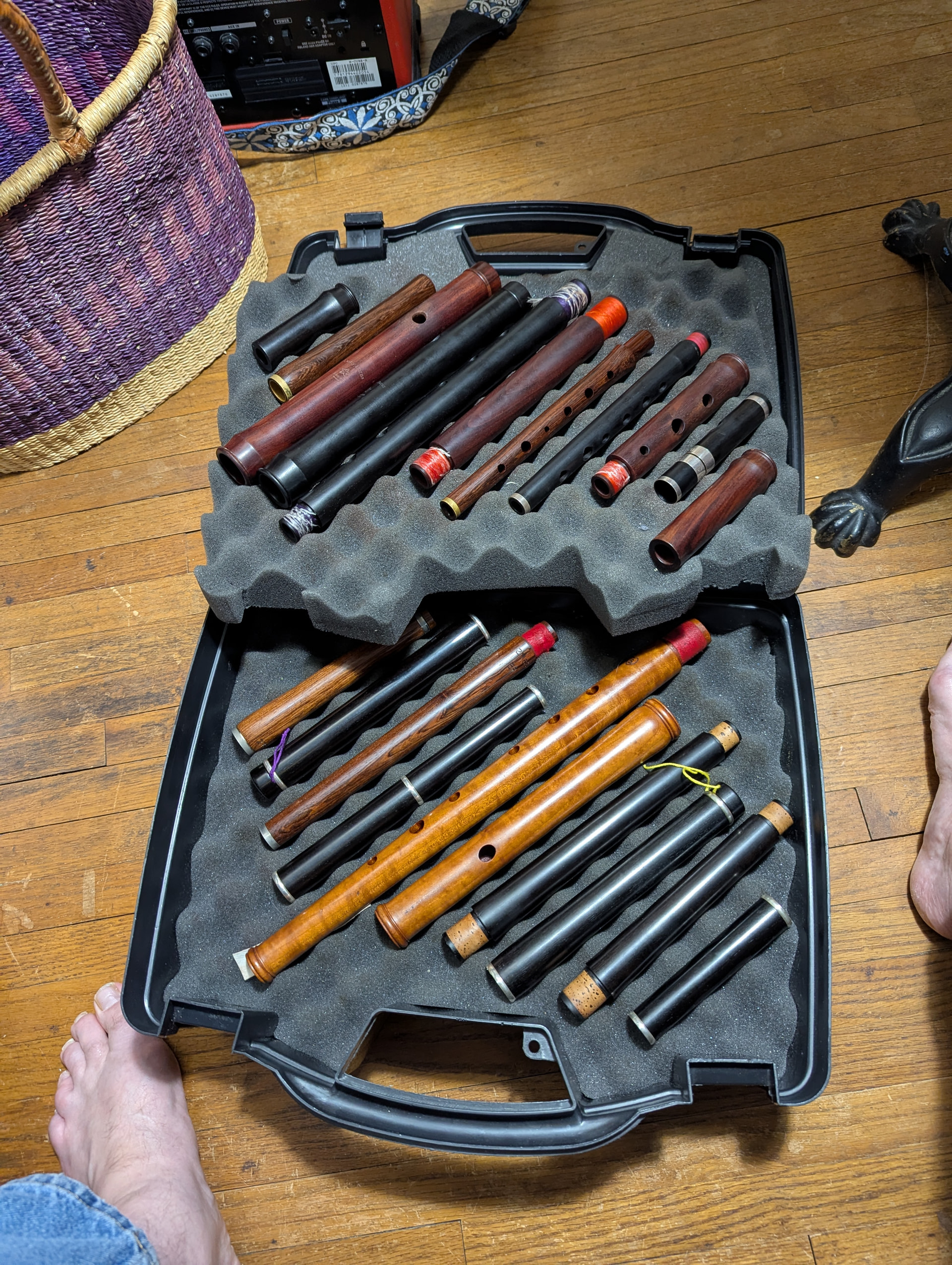 Roll and pocket cases work great for 1-2 flutes, or a small collection of small whistles, that sort of thing. If you’re carrying something indestructible like metal flutes or whistles, you can sometimes get away with a few soccer socks.