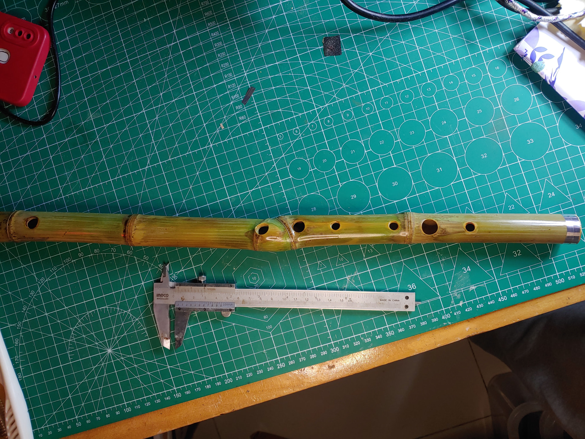 Also, the bamboo species that you are using is pretty far from being ideal, which you undoubtedly know already. Optimally, you would want a species that gives you greater inter-nodal distances and (if possible) thinner walls. Unless you live in a bamboo-rich environment this can be problematic. I have a bamboo xiao from a maker in Taiwan (the talented Winson Liao) and it is a fabulous flute. I was talking about this flute with one of his students (who loaned me the flute) who had visited Winson. I was remarking on how well this flute turned out and he commented that it all comes down to bamboo selection. Winson has a license to harvest all types of bamboo that are indigenous to his area, so he gets to cull vast amount of these canes, only choosing those that will lend themselves to making a good flute. For every one he selects he probably discards dozens. This is my own experience. Only a tiny fraction of bamboo stalks have flute potential if you are wanting a fully realized instrument that plays in tune through two octaves. It’s easy to make a “hippy” bamboo flute with a big, sweet voice that will play the first octave in tune–you can do that with all sorts of bamboo. But you are clearly going for something more sophisticated.