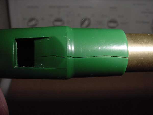 A large number whistleheads of various brands I’ve inspected have a line that looks like a crack where the molten resin meets at the top of the mold. In most cases, even though it looks like a crack, it isn’t a crack and never develops into a crack. However, as you can see from the photos, sometimes the whistlehead does fail along that line. I can’t tell from the top photo if there’s an open crack there or just the line that looks like a crack.