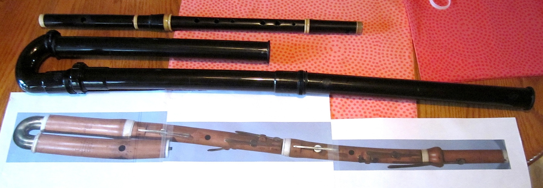Finally (from the images on the LOC website) a bass flute by Wigley and McGregor circa 1815 at the Dayton Miller Collection, #1239, printed to actual size. The view is about a meter wide and the sounding length of that flute is around 1100mm. I took measurements of this one when I was there recently. Peter Noy sells one very similar based on a flute by Delusse, circa 1750, pitched at A-415, for $4900. I am looking at some of the contrabass flutes and subcontrabass flutes and thinking of the usefulness of a simple system fingered version of these. It could be fun…