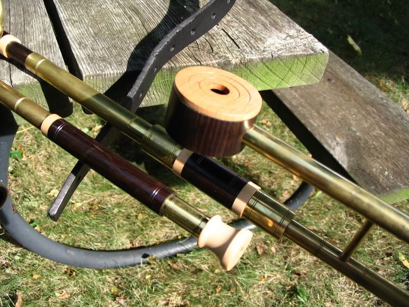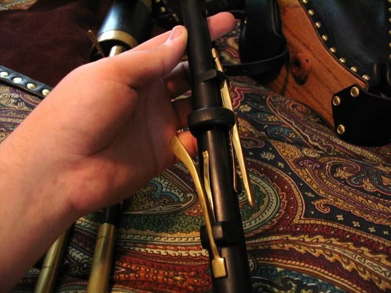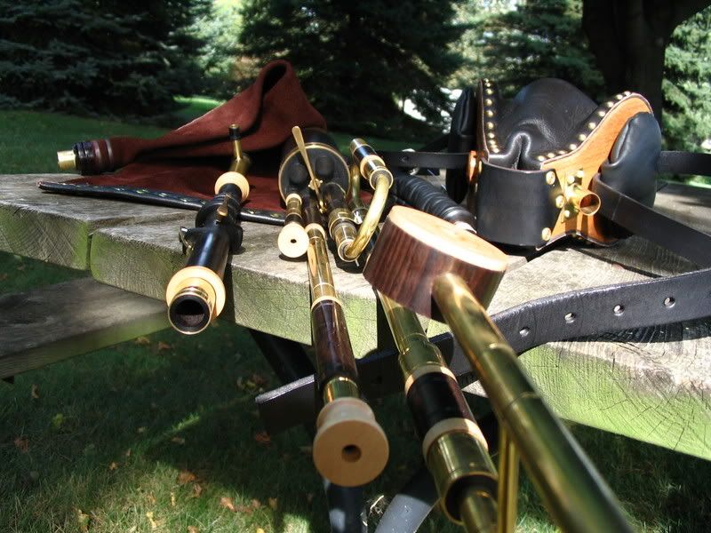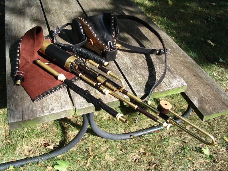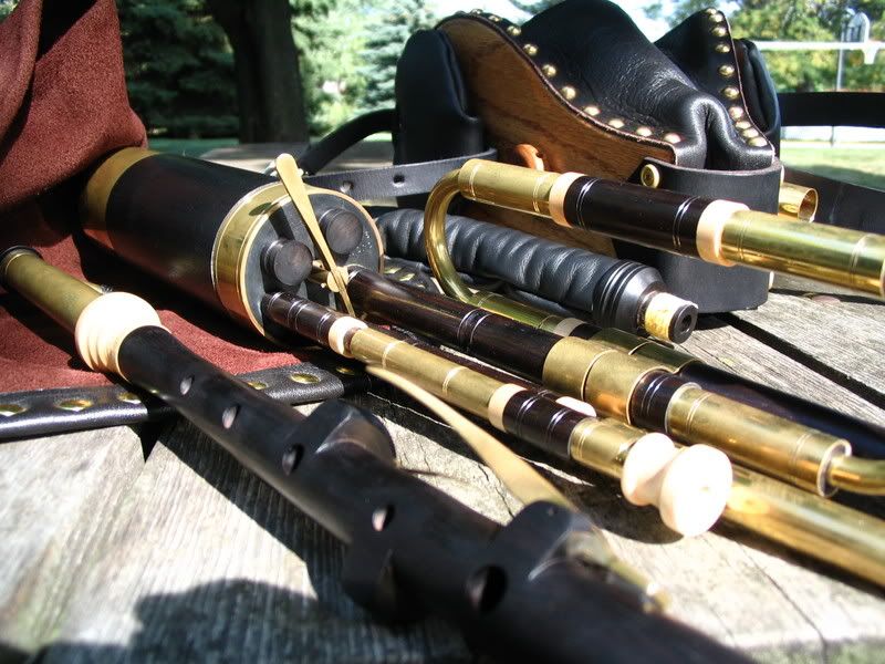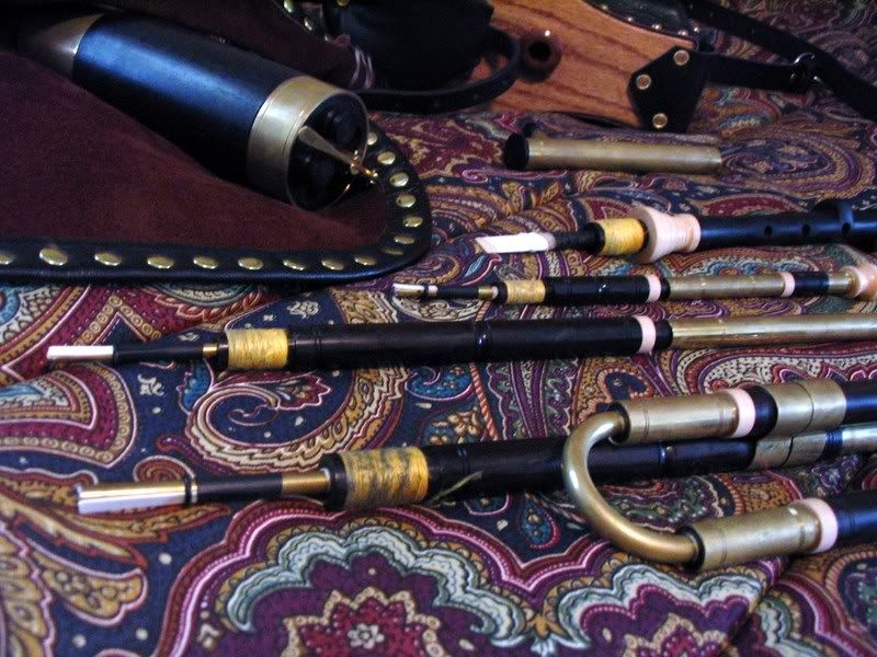 This is a really beautifully made set. The wood (ABW and Maple) has been finished very well. All is simply decorated, but very tastefully so. Brass is already getting some tarnish from all the handling! The chanter is really mellow for ABW, and I love it! Drones are still finding their stable point, but purr like a basket of kittens (or would it be a hive of kittens? ) I had made a few stylistic requests for this set, and Chris was a great sport about incorperating my ideas (the bass done puck in contrasting woods, the caps for the drones (and regs) are different than his normal tapre).