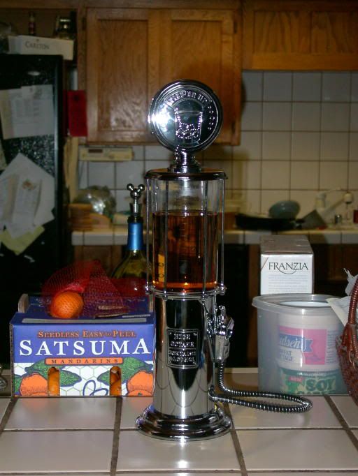 I do have to say that it’s awfully cute, though. The liquor dispense through the pump handle. If you’re not careful when you hang up the pump handle, however, the whiskey dispenses all over the living room…which is why my house smells a bit like we had a really wild party here at the moment (there’s a bit of a learning curve with this thing).