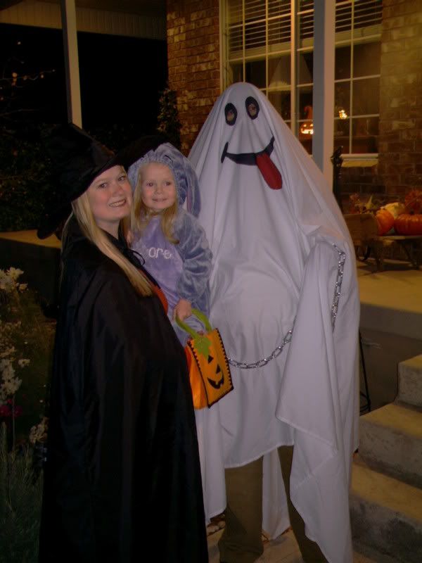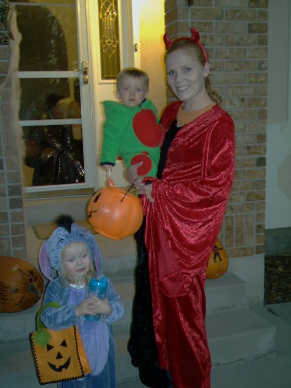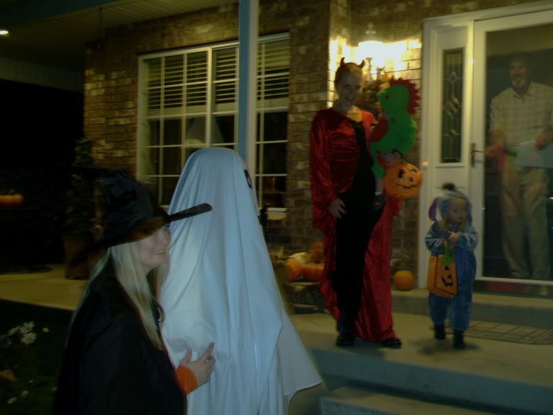 I’m the ghost, Eyeore is my daughter and the witch is my sweetie; the devil with the little tyke dressed as a dinosaur is my sister and her son Logan: