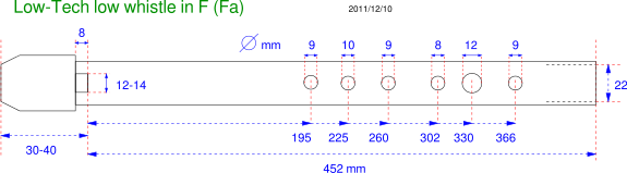 And yes, I would use a smaller diameter pipe for an F flute. But! … others have used 22mm pipe to make an F whistle. Take a look at Dr. Guido Gonzato’s Low Tech Whistle designs. He has a design for a low F made with 22mm pipe.