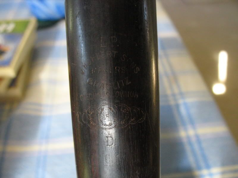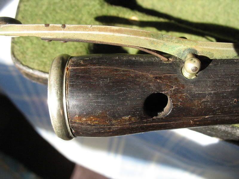 -a previous, and not very good, repair to what must been a big piece broken off the top of one of the barrel pieces, right through the tone hole.