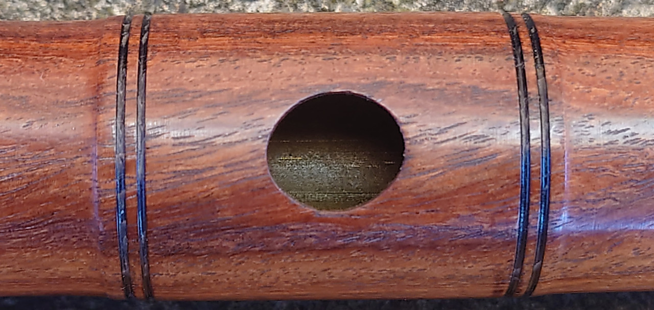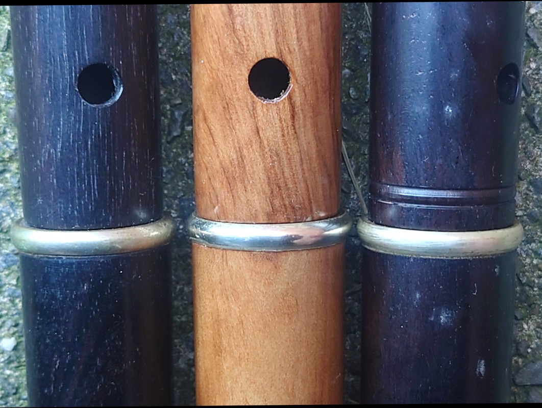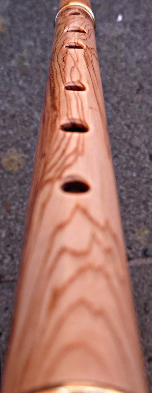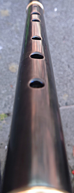 The scale intonation of all three is good (and consistent enough between the three despite slight dimensional discrepancies noted above) - pretty much as good as it gets for a keyless diatonic flute, and better than I’ve come across from some (admittedly lower end price-wise) modern “Western” makers. They play for me (in average ambient humidity and temperature) at A440 with the tuning slides open to the third graduation mark. The open C# fingering at the top of the 1st register is not significantly flat, so unsurprisingly the most common C natural cross-fingerings, oxo xxx and oxx ooo, both tend significantly sharp, but oxx xoo or oxx xox work well and may be chosen between to suit. At the top of the 2nd register the open C# is very flat (as expected), but the standard cross-fingering, oxx xoo, works well and again the usual options for C natural cross-fingerings are available to choose between, oxo ooo and oxo xxx being the best. The Es, always a relatively weak note on simple flutes because of necessary hole position/size compromises and especially where there’s no Eb key to vent) are pretty good (pitch, timbre and relative volume) and 3rd register D fingered oxx ooo is good - not always the case without an Eb key to vent. Almost none of the baroque cross-fingerings for chromatic notes work in the first two registers, as might be expected on such a large-holed flute; the 1st register Bb (xox xxx) is the only really usable one, plus maybe the G# xxo xxx (well lipped down), while the 2nd register equivalents don’t really work at all, so these really are principally diatonic instruments. The 3rd register diatonic scale is available with quite decent tone and intonation up to the high B, plus some of the chromatic notes, not that many folk who play this type of flute want to access the 3rd octave above D. There is the usual simple system conical flute tendency to trend sharp on 2nd register G and A, but it’s within normal expectations to be controlled by good embouchure technique. In all these respects there is consistency across the sample and there is nothing untoward requiring design alteration.