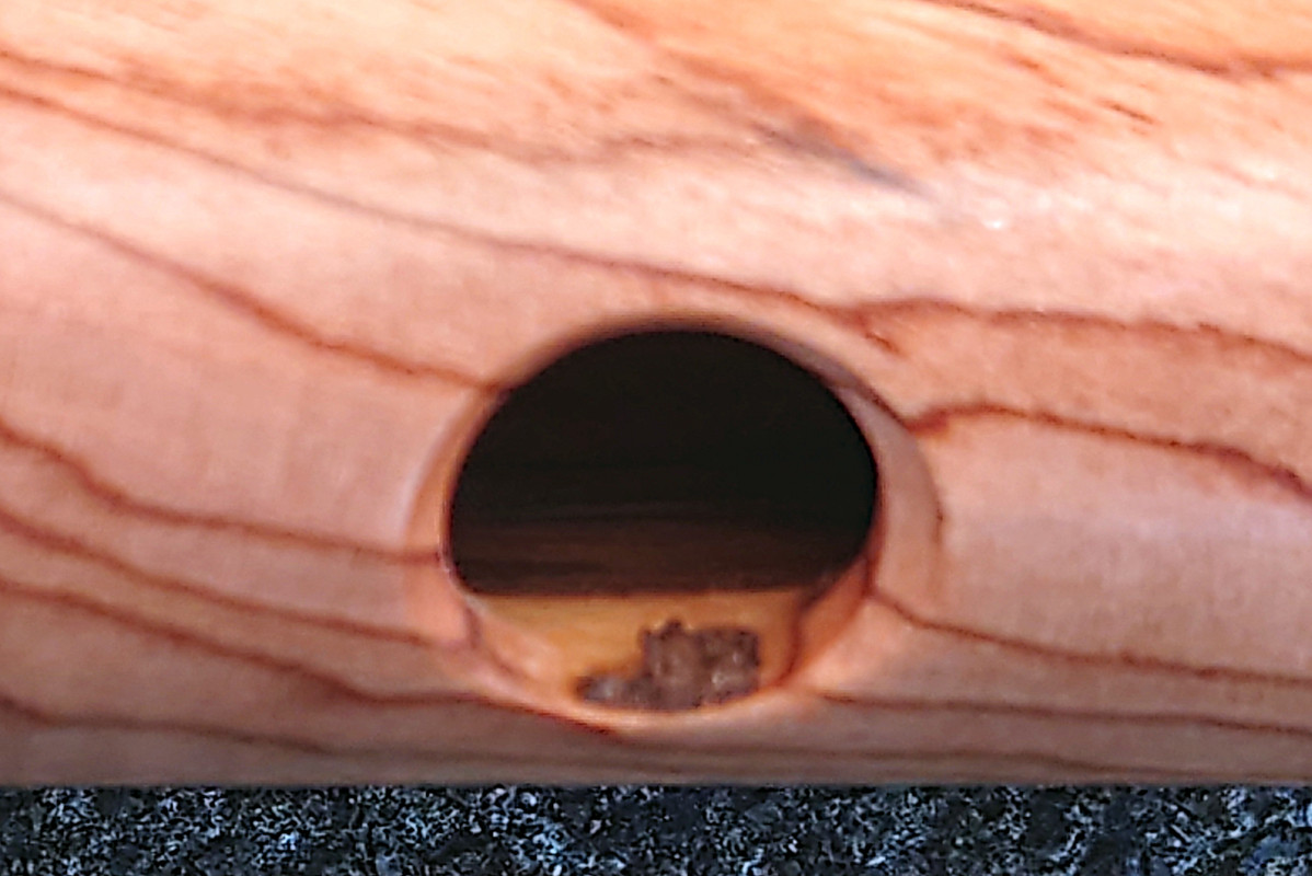 Drill all holes (including embouchures) in the side grain, not the table grain/V patterns.