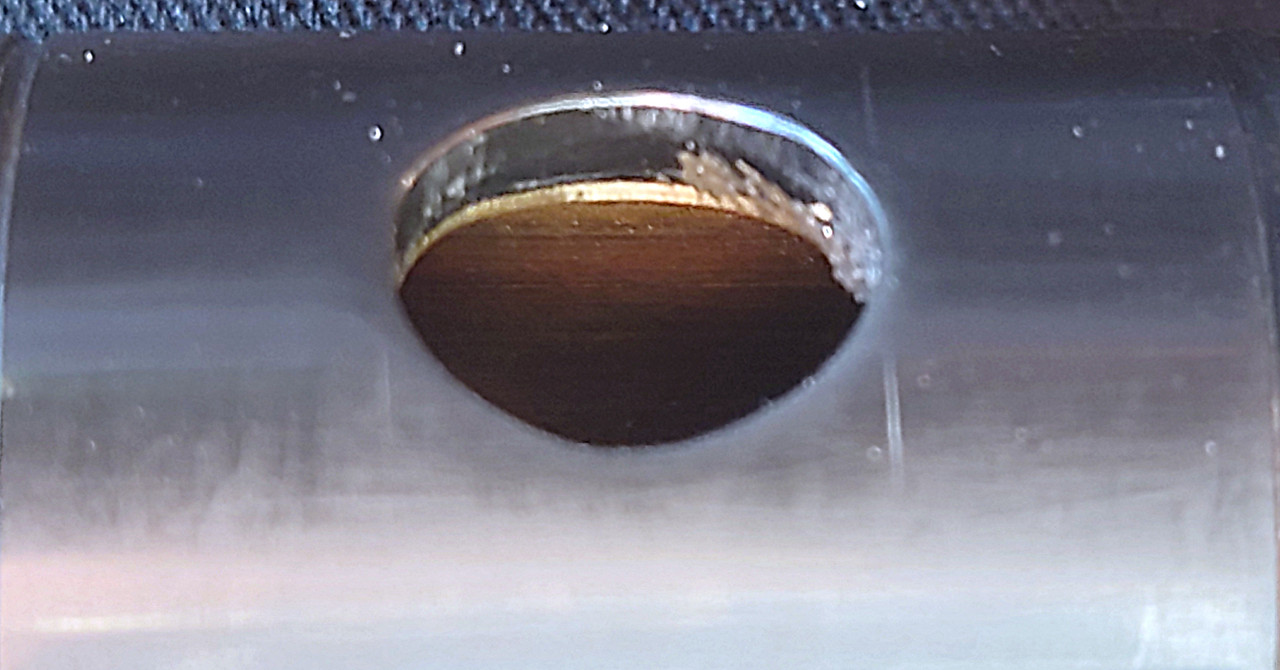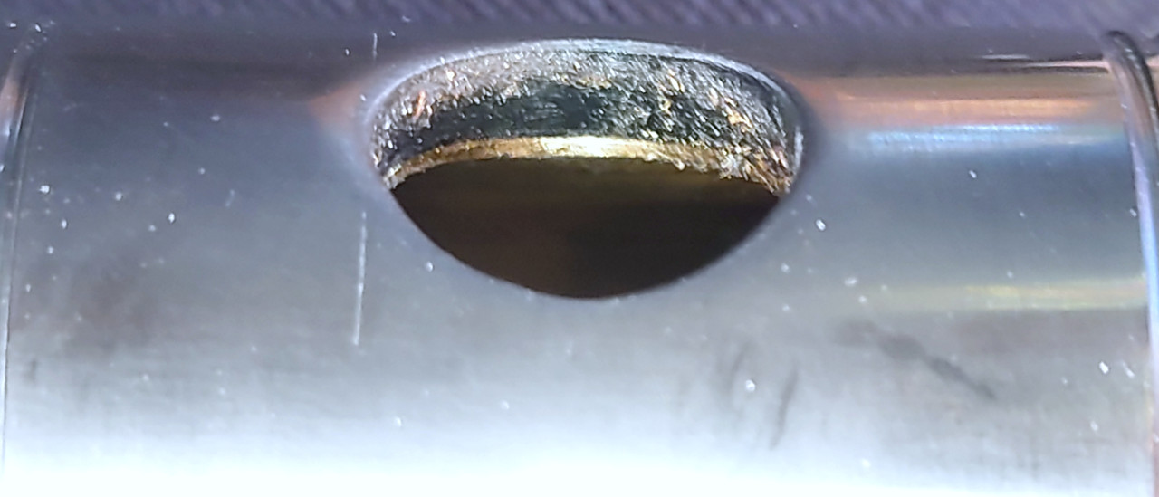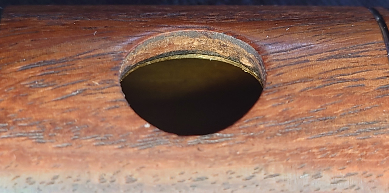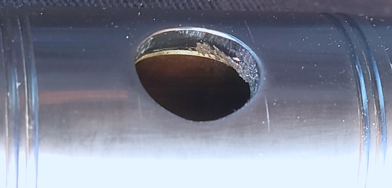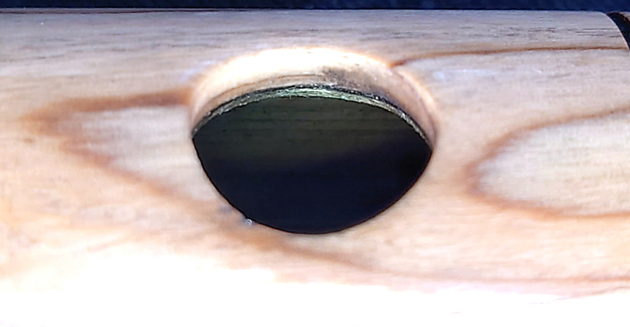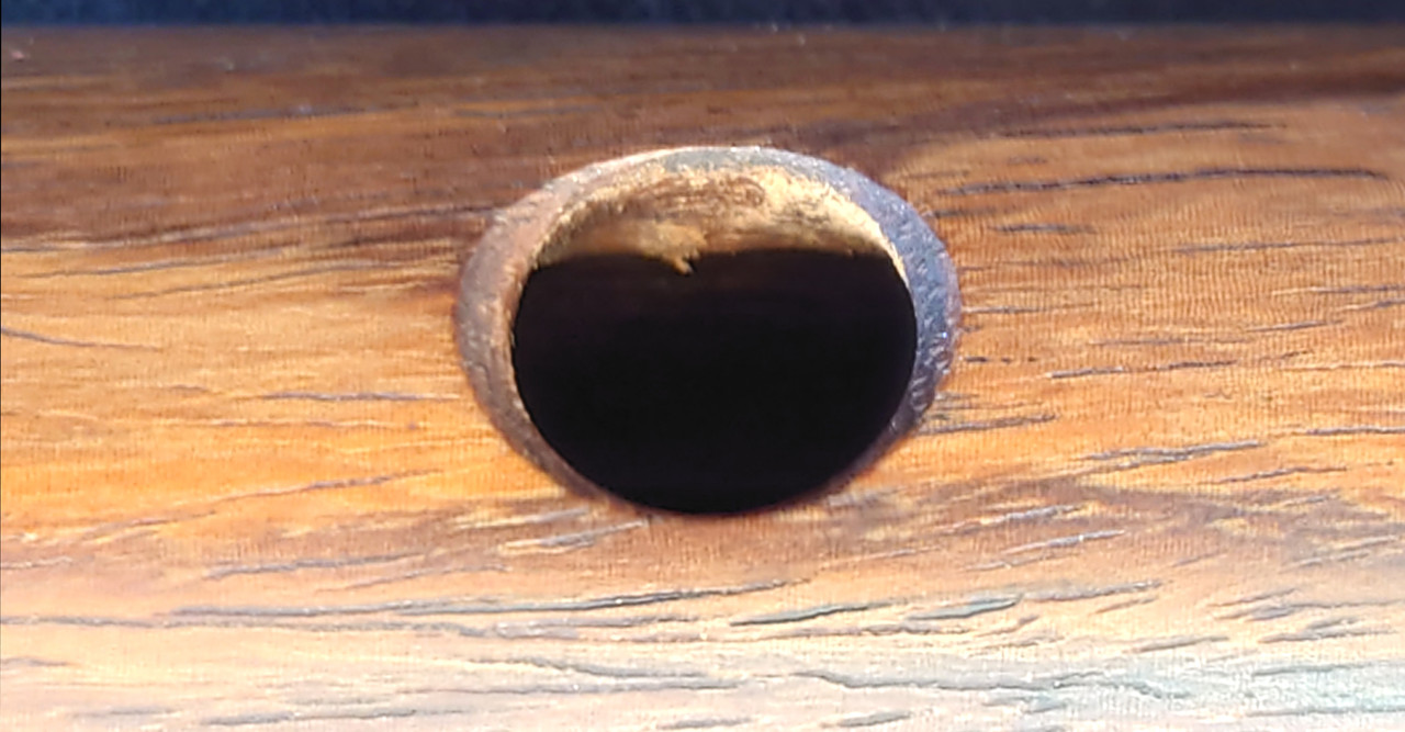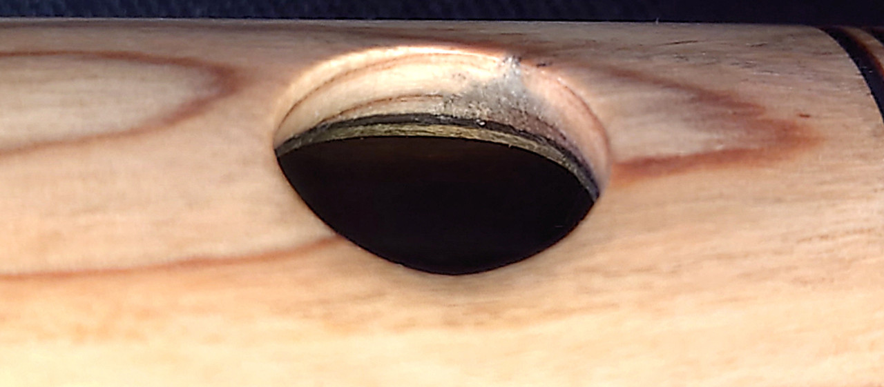 13b. R Embouchure hole - view to target wall - note sharp inward metal rim and the “sandwich” effect of being cut in the flat grain causing textural differences