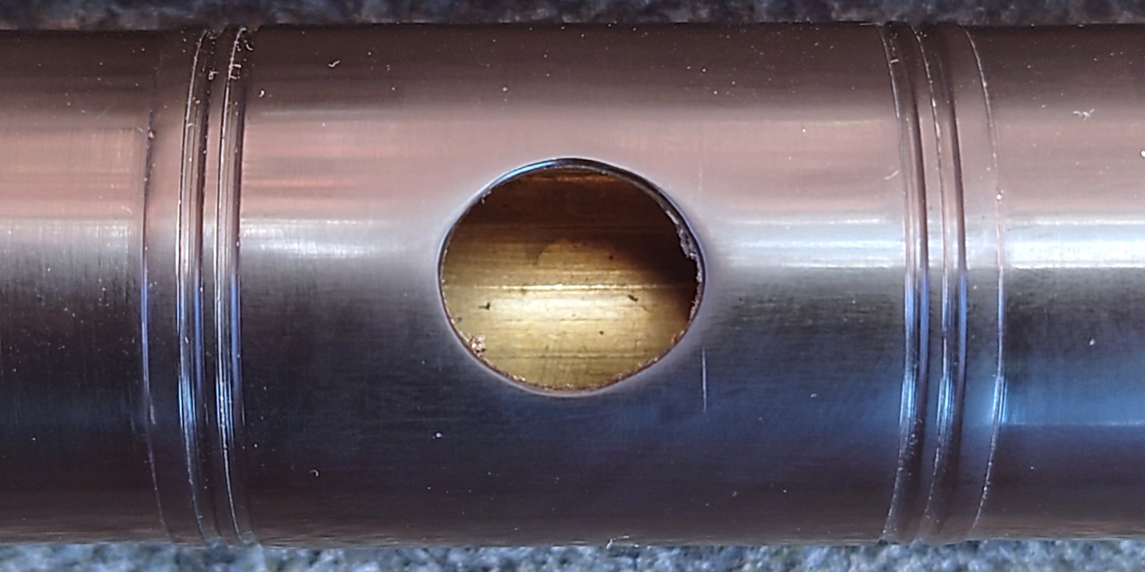 I am not equipped to measure bore dimensions in the conical bodies, so cannot make any comments on design or consistency of the bores. However, from visual inspection (including with a bore scope) the bores are clearly the worst aspect of these flutes in terms of finishing/production standards. They are rough, as bad as I’ve seen on other Pakistan-made flutes - so rough that the condensation from playing doesn’t flow out of them freely and they snag and accumulate any lint from a swab cloth! They do not seem to have been re-finished in any way after being reamed and one suspects the reamers aren’t kept properly sharp. P in particular is very rough, with obvious reamer chatter (Images 26-34 below & Video 3). All three also have scarring of the bore opposite the tone-holes, presumably from the cutting and/or finishing thereof and tools going in too far. Given the proven ability to finish the exteriors to a good standard, this is inexcusable. If the bores of these flutes were sanded and polished to the same standard as the exteriors and the internal edges of the embouchure and tone-holes were properly rounded off, it would make a very significant difference to quality and, almost certainly, improve the sound the flutes are capable of making.