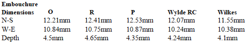 I’ve put the information above into a table (below) for easier comparison. The N-S length of the embouchure hole is the longitudinal dimension (along the length of the head), the W-E width is the lateral dimension (across the tube, the blowing direction) and the depth is half the difference between the head bore diameter and the external diameter at the embouchure hole. (I haven’t included the Boosey Pratten as the embouchure has been bushed/is not original, so only the chimney depth is original.)