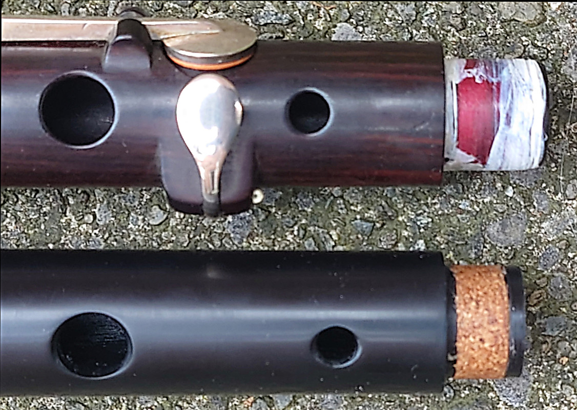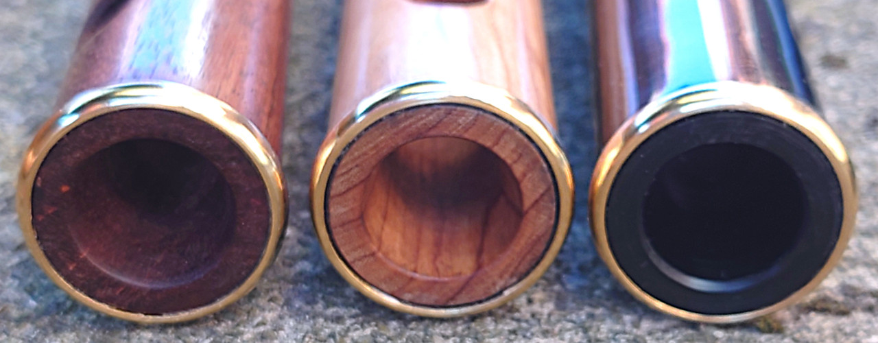 On the wooden flutes there is no attempt to match the grain across the joints (see Image 1), but at this price level I think that’s quite acceptable. Less acceptably, on the wooden ones all the holes are drilled in the V patterns of the flat or table grain - typical of Pakistan-made instruments. In my experience all good quality “western”-made wooden flutes, both antique and modern, have the embouchure holes and the main run of tone-holes drilled in the narrow, close-set side grain at right angles to the Vs - clearly historically established good practice (no doubt for good reasons from intimate knowledge of timber but not known to the Pakistani makers)! (To be fair, admittedly on O the body and foot have rather confused grain patterns!). To see what I mean, either study some antique flutes (in the flesh or in online images) or browse illustrations on e.g. this web-page of a very fine modern maker (other makers’ websites will corroborate!), paying attention to grain orientation and hole placement.