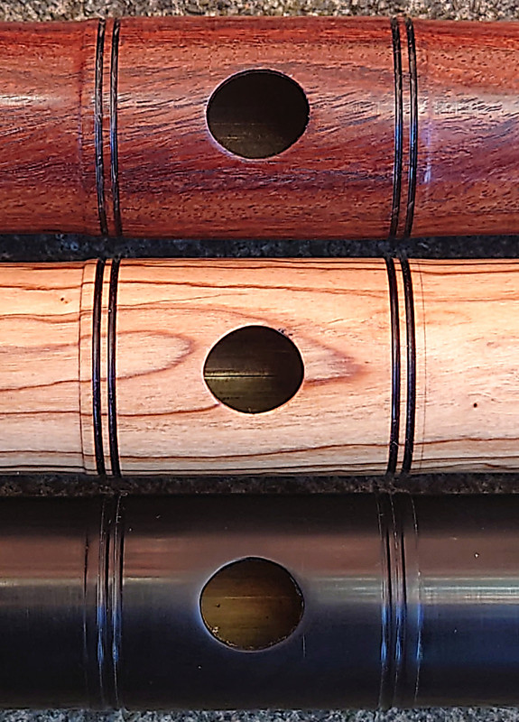 This review will be set out in two main parts – a physical inspection/description and evaluation first, then a musical one. There is a general point which will come up repeatedly - consistency of accurate production within design is an important aspect of flute-making, significant in assessing a maker’s output. That is one reason I requested multiple sample instruments. Where relevant in what follows, I will refer to the three flutes as R (rosewood), O (olivewood) and P (polymer).