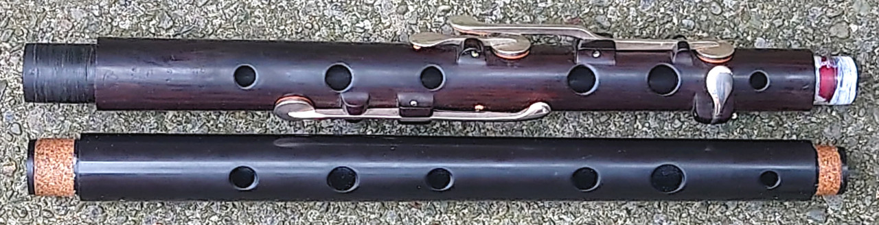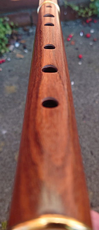 I have quite a bit of prior experience with apparently similar “Irish” keyless flutes made in Pakistan (by assorted makers unknown) in the general style of Pratten’s Perfected flutes (one-piece body, large tone-holes), having bought quite a few over the years when they’ve turned up second-hand on eBay for under c£40. These were bought with a view to possibly improving them, especially by bushing and recutting the usually hugely over-sized and badly cut embouchure holes and by re-finishing the usually rough bores and tone-holes and badly done tenon lappings. Some of the other designs of “Irish” flute to be found on eBay and in music shops, especially the keyless ones based on a Meyer type body configuration (with lower body and foot in one piece rather than the upper and lower body sections being in one like the Pratten style models) are invariably absolutely execrable in all respects, totally unusable musically and an immoral waste of even low grade timber and maker effort. I’ve had a few of those acquired cheaply too, and they’re always irredeemably awful. On the other hand, the Pratten style ones usually at least have the tone-holes fairly accurately sized and sited and play in-tune scales, but the embouchures are bad and the execution and finish mostly pretty poor. I’ve had a couple where, although not well cut, the embouchures were not oversize which allowed me scope to improve them and then sell them on. I’ve long said that if the Pakistani makers would significantly up their game on production values (certain design details improved and then consistency and finishing and quality control) it would not be beyond them to produce worthwhile instruments.