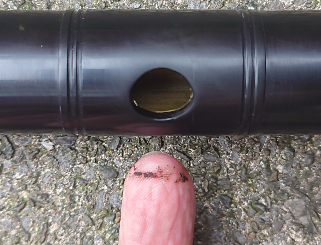 - P Embouchure hole - as-received gunk wiped out on fingertip!
