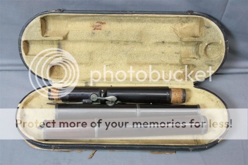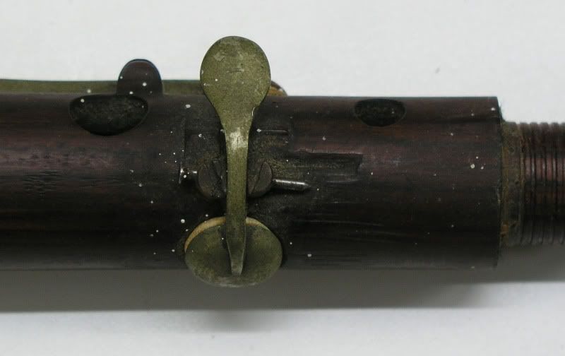 On the positive side the partially lined head joint is intact, with a nice clean oval embouchure hole and threaded wooden crown stopper assemblage. All keys are also intact, the slide functions nicely, and the wood is a nicely figured cocus (I think). On the other hand there is the typical, thru and thru barrel crack, two posts that need replacement, sticky springs, a foot joint that rotates, but will not separate, a frozen cork, and a complete repadding and tenon threading in my future.