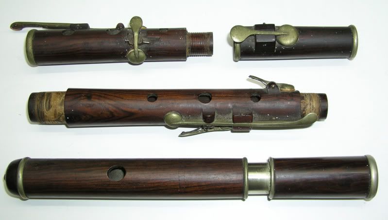 Well I’ve finally taken the plunge and, after many heated battles, been successful in an e-bay purchase of a “fixer-upper” flute. It has just arrived in my hot little hands, thank you UK postal strike, and I’m very excited to get my hands dirty working on it. This one appears to be a mid 19th century, block mounted, 6-key, Metzler with a short foot (visually looking a lot like a McGee GLP). I hope it plays in A440, but will not be able to tell until some repairs are made. When I get a chance I’ll measure the hole separation and compare it to those listed on Terry’s site and with my blackwood Ward and delrin Seery unkeyed flutes.
