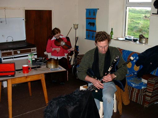 I edit in a photgraph taken by Mick at the time, a bit of a reversal of roles as I had been pointing the lenses at the lads all weekend, when we weren’t playing tunes that is. Personally I would have moved the chair so you could see a bit more of the pipes.