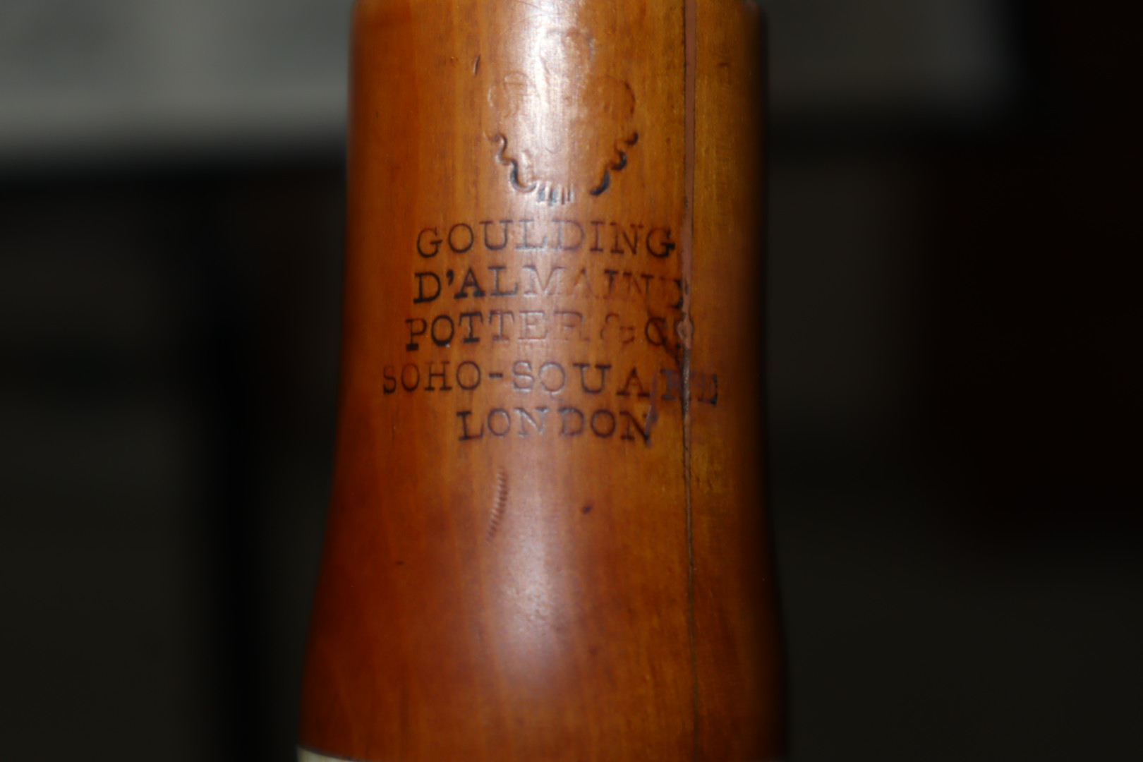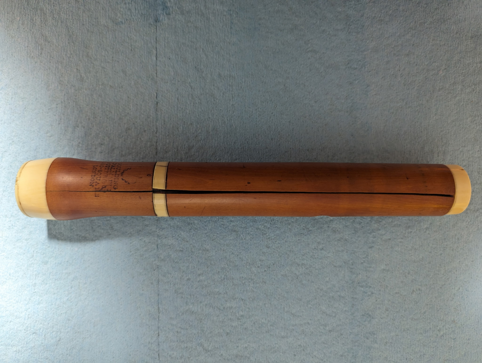 After about four hours of careful twiddling, I’ve managed to disassemble all the wood-on-wood sections without inflicting further damage to the instrument. The brass(?) barrel to head joint connection seems hopelessly stuck though. I’m guessing that many years of contact in varying humidity conditions may have fused the connection beyond safe repair.