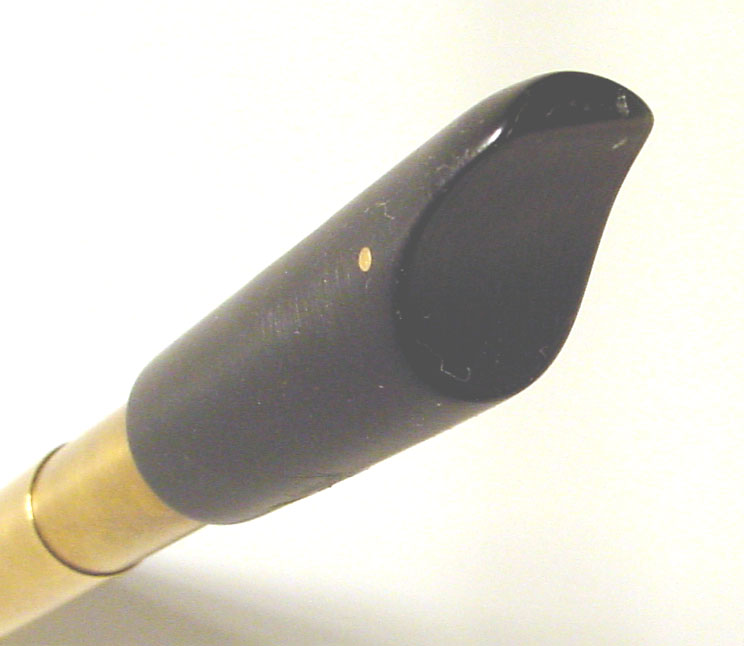 Here’s another angle on the mouthpiece, showing the fipple area. The mouthpiece is held together with brass pins, much like a Syn. Unlike a Syn, they’re cut off flush, and finished cleanly, whereas with Syn whistles, the pin head is left on, so as to allow someone to take apart the head for cleaning. It’s hard to see cleanly, but the windway area is curved, which helps with condensation.