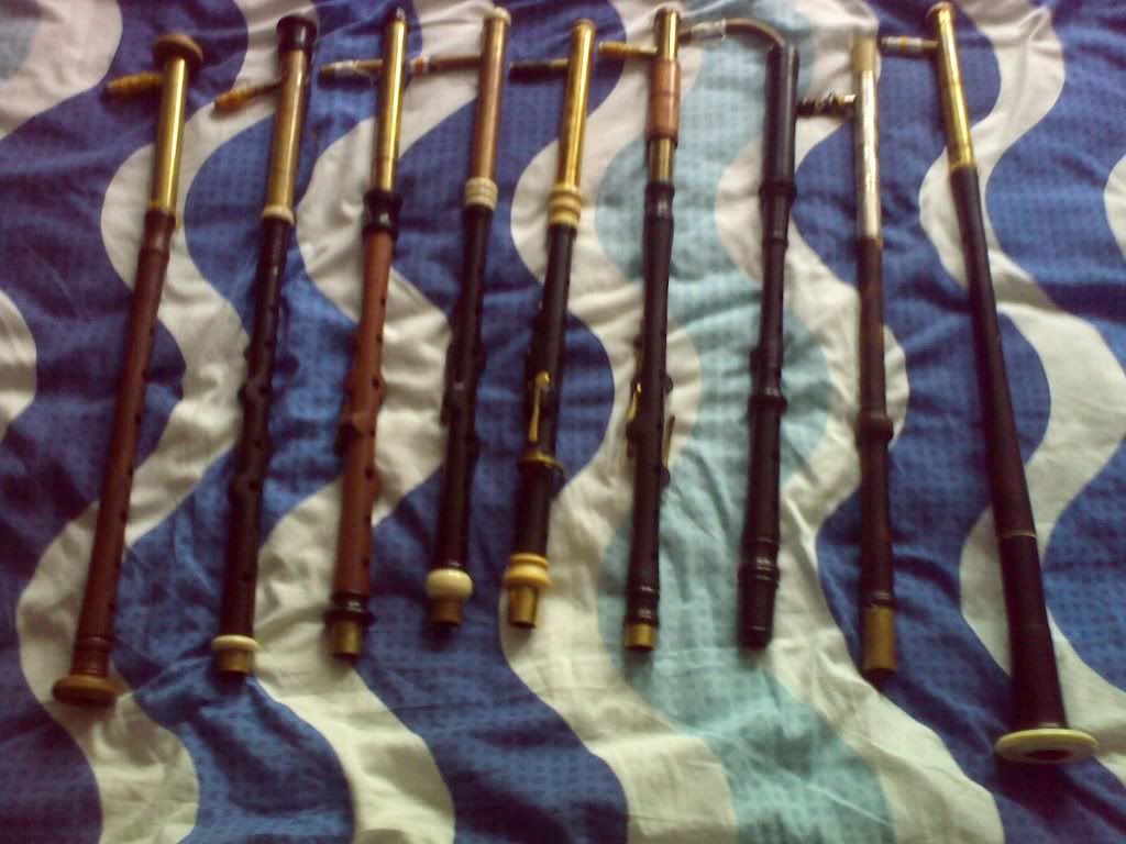 The two chanters on the RHS of the photo have had a similar treatment - they were deep fried in oil and the outsides set alight to get the dark colour (the wood used to make them was maple).