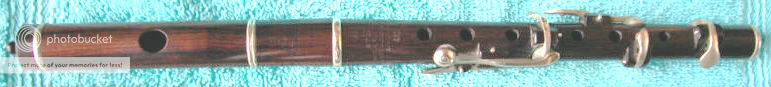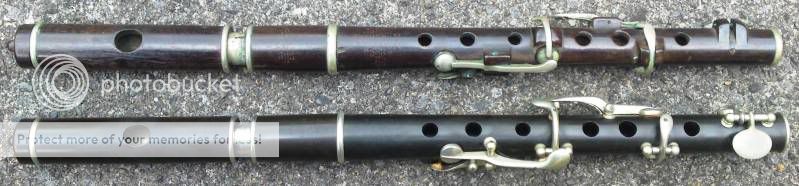 By way of comparison with the current eBay one, here’s a photo of my own two Rudall Carte & Co. D piccolos, #1783, cocuswood, made in 1886 (by Wylde) and #6974, Ebonite, made in 1922 (by Linfoot). Both have German Silver keys and fittings.