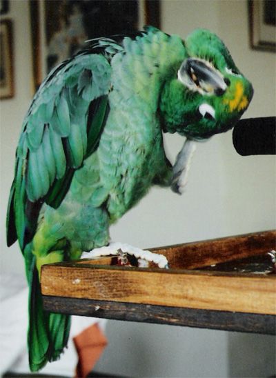 Here’s Kelly, a mealy Amazon parrot who adorned my mother’s apartment for several years. I recently received an old box of my stuff, which included these photos I had taken.