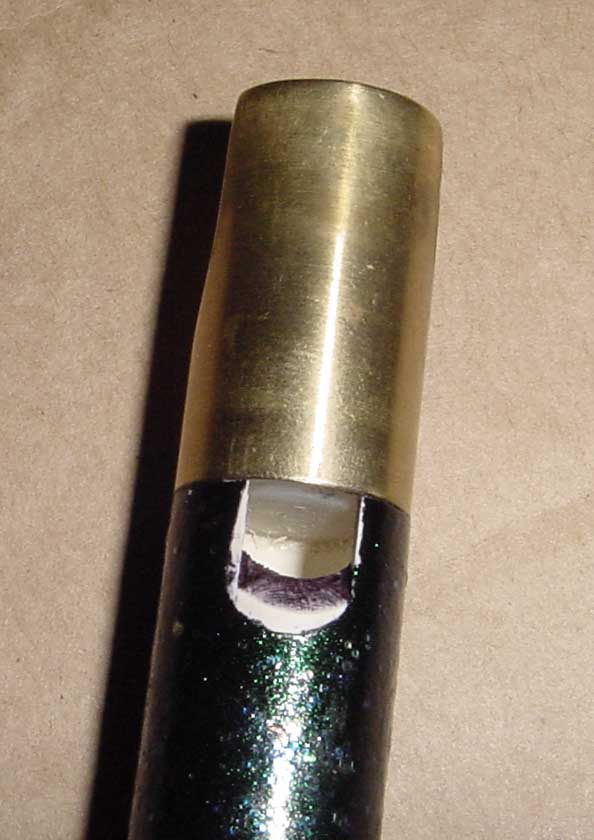Here’s the tuning slide area, which is basically a sleeve of brass for the PVC to slide into. With the slide pulled out this far, the whistle is quite flat. Bill uses beeswax to help snug up the slide and prevent air loss. It does the job nicely. The only thing I don’t like about beeswax on the slides is that it makes the tuning slide feel a little “gummy” instead of “smooth”. But it does work, and the Serpent Music website mentions that you get some wax with your whistle so that you can keep it maintained. And if I had my choice of between “gummy” and “won’t stay put” or “leaks air”, I’ll choose gummy every time. ![]()