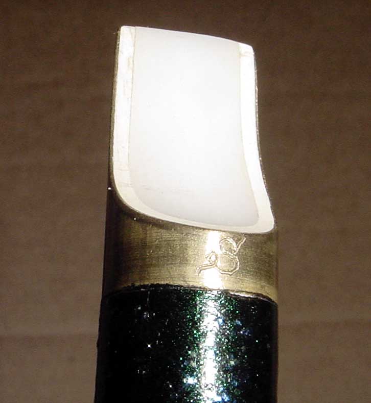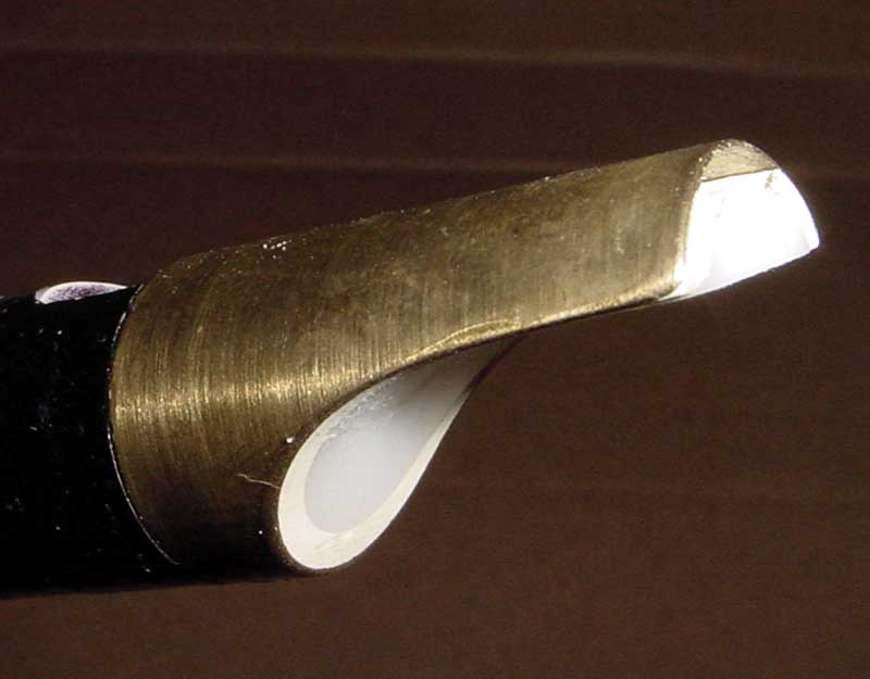 Here’s another angle on the mouthpiece, showing the fipple area. The beak on the Serpent whistles are extra long compared to many other high-end whistles, making them fit comfortably in the mouth more like plastic-headed inexpensive whistles. Some people find it hard to get used to the shorter beaks on most high-enders (like Overton, Greenwood, Copeland, etc), or even the extra-stubby mouthpiece on an Abell or Susato. You won’t have that problem with a Serpent. The windway is curved, with the Delrin fipple serving as the floor and the brass tubing serving as the roof.
