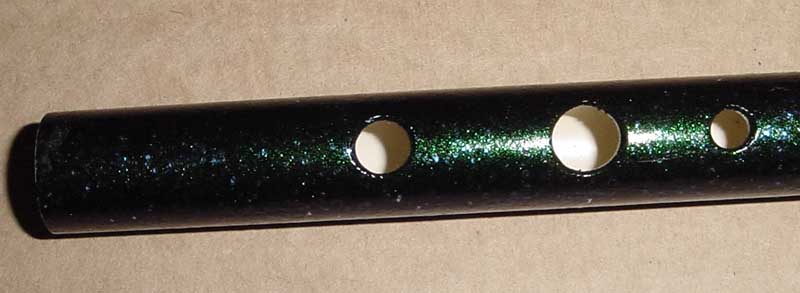 The Sweet Polly comes in a variety of colors. The person who originally owned the whistle told me it was originally painted in illusion blue-to-purple color-changing paint, and that she added a layer of glitter nail polish. Also, she told me that she didn’t like the unpainted windway glaring white amid all that color, she blackened it in with a permanent marker. The whistle still looks nice, for all that, and people have commented on how neat the coloring is. The whistle itself is fundamentally unchanged: CPVC construction incorporating brass tubing in the tuning slide and mouthpiece, and Delrin for the fipple.