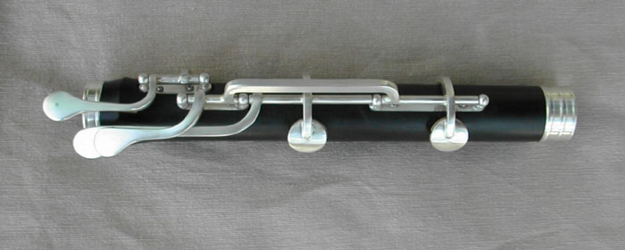 A few details for other makers. The spring on the A# key (what would be the Eb key) is a normal one, located under the touch. For the bottom two keys, I use springs similar to those I use on my short F keys, located on the bars that extend across the axle from the pads. These bars also control the opening of the keys, and have cork bumpers embedded in the body underneath to quiet them. Since the purpose of the springs here is to keep the keys open, not closed, the tips of the springs go past the axle, almost to the pads themselves (these nicely pull out of the way when the keys are closed). The timing at rest between both keys is adjusted with a spot of cork on the underside of the upper touch. The pads on the low keys are cork, glued to curved “flat” pads and sanded to fit the profile of the flute body. Both are sanded simultaneously while closed, until both play in well, thereby adjusting the timing.