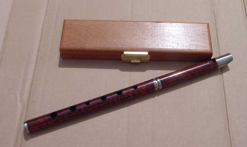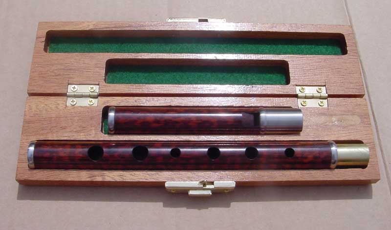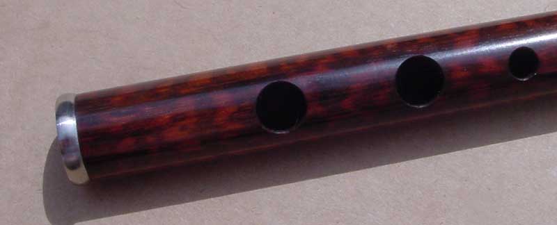 This is an awesome looking instrument! If my blackwood Abell is a panther, this whistle is a leopard. The snakewood has a nice warm orange-brown color with a highly-pleasing spotted pattern which is really reminiscient of snakeskin. The craftsmanship is impeccable, and the stainless steel ferrules accent nicely.