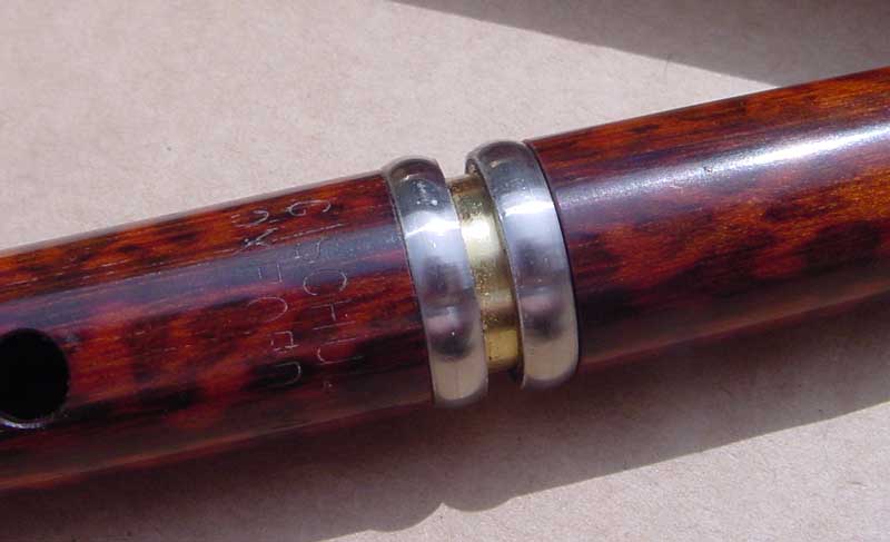 A view of the tuning slide. Here you can see the brass tuning slide as well as the ferrules in this area. At the risk of sounding like a broken record, the workmanship here is practically flawless. Here you can also see Glenn’s mark on the instrument: his name and city. This is very lightly done and unobtrusive. I was afraid it might not show up in the photograph. A word about the tuning slide: Glenn has improved it tremendously since I last had a Weasel (or a Busman). The Busman and the old Weasel I had both had tuning slides that were a bit loose. If I got excited while playing, I could easily push them closed, making the whistle go sharp. Glenn has snugged up the slide considerably. There’s no way I’ll be accidentally pushing this one shut. Glenn did mention that there are free repairs on this instrument for his lifespan, so if your slide goes loose, let the professional fix it!