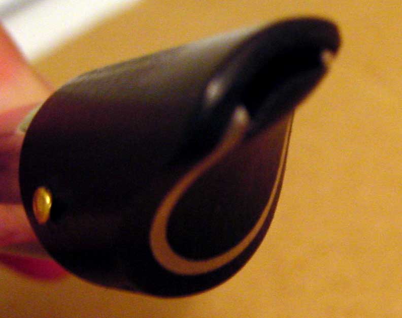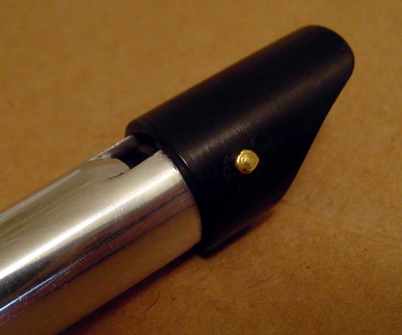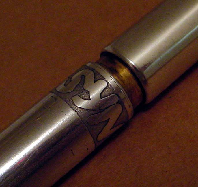 Here’s a closeup of the mouthpiece. You can see the pin that holds the head together. That pin is unique to Syn whistles as far as I know. Removing it allows you to disassemble the mouthpiece for cleaning, which Erle told me he did also before sending it to me (thanks Erle!). The labium ramp is well pressed, with no deformity around it.