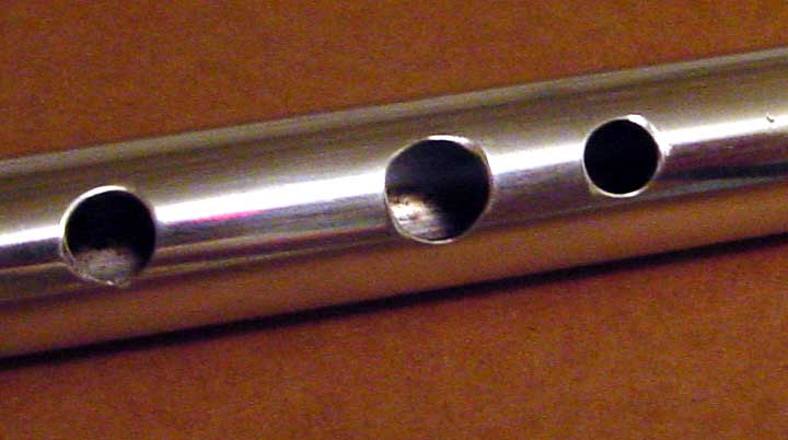 The holes on the Syn are mostly round. They do show some signs of having been worked a little, I assume as part of the voicing process, but nothing too rough. Here you see the D E and F# holes. The E and F# holes are a little too close for some people’s comfort.