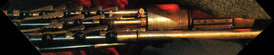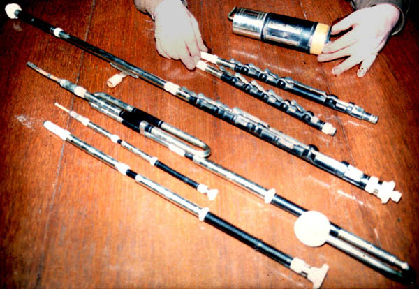 This is Harrington. Note the very fancy three piece regulator end caps, with an ivory end socketed into a metal ferrule, which meets an ivory mount which is on the end of the regulator (I THINK! That how they’re put together, Peter?). Only the bass regulator’s endcap is intact in this picture. This is unique to Harrington; I wondered at first if the Ebay Willie Rowsome set wasn’t a “budget model” Harrington or something, but it’s just Willie imitating him, it seems. The shape of the endcaps is, again, reflected in the drone end mounts. The tuning rod’s mount is also much fancier than Coyne and Egan’s simple spheres. Very fancy stuff here. The standing piece of the drones is encased in a long ferrule inbetween two mounts, another feature unique to Harrington. I’m told that the face of the stock of Geoff Wooff’s Harrington set has a silver cover soldered to the stock ferrule, with holes drilled in it for the pipes (of course); I can’t tell from these pictures if this set has this feature, do other Harrington sets have these stock faceplates? Also note the square section guide block on the longer regulator keys. Coyne and Egan’s are rounded on the top.
