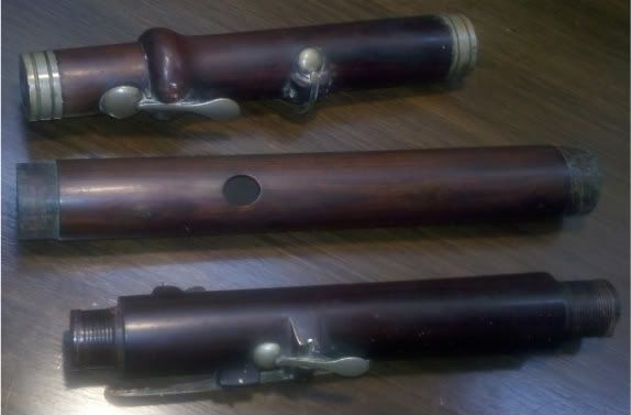 Not sure if this one classifies as a band flute, but here is my latest flute renovation project. Sorry for the lousy photo, but it was the best my phone could handle. Here I have the rings off the headjoint to prepare to seal up the three hairline cracks the unlined headjoint sported (guess it isn’t just the flute shrinking over the liner that can crack that…). You can also see where the short A (normally F) key block is cracked and needs repair. I’ve since fixed the cracks, cleaned up the (5) keys, and rethreaded the tennons. Still need to repad the keys, but couldn’t help the urge to try it out, so I plugged the various holes and gave it a go. Seems to speak well, somewhere in F, but I’m not sure if it is at A 440 yet. Fun to play such a small flute, a real change from a D.