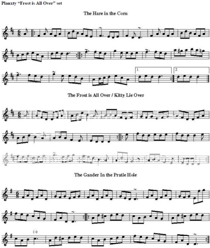 The Planxty set is listed as The Hare in the Corn, The Frost is All Over and Gander in the Pratie Hole. For some reason, no-one ever seems to muddle the latter with the first two, but there’s a significant tendency to play the B music of the second to the A of the first, or some such…