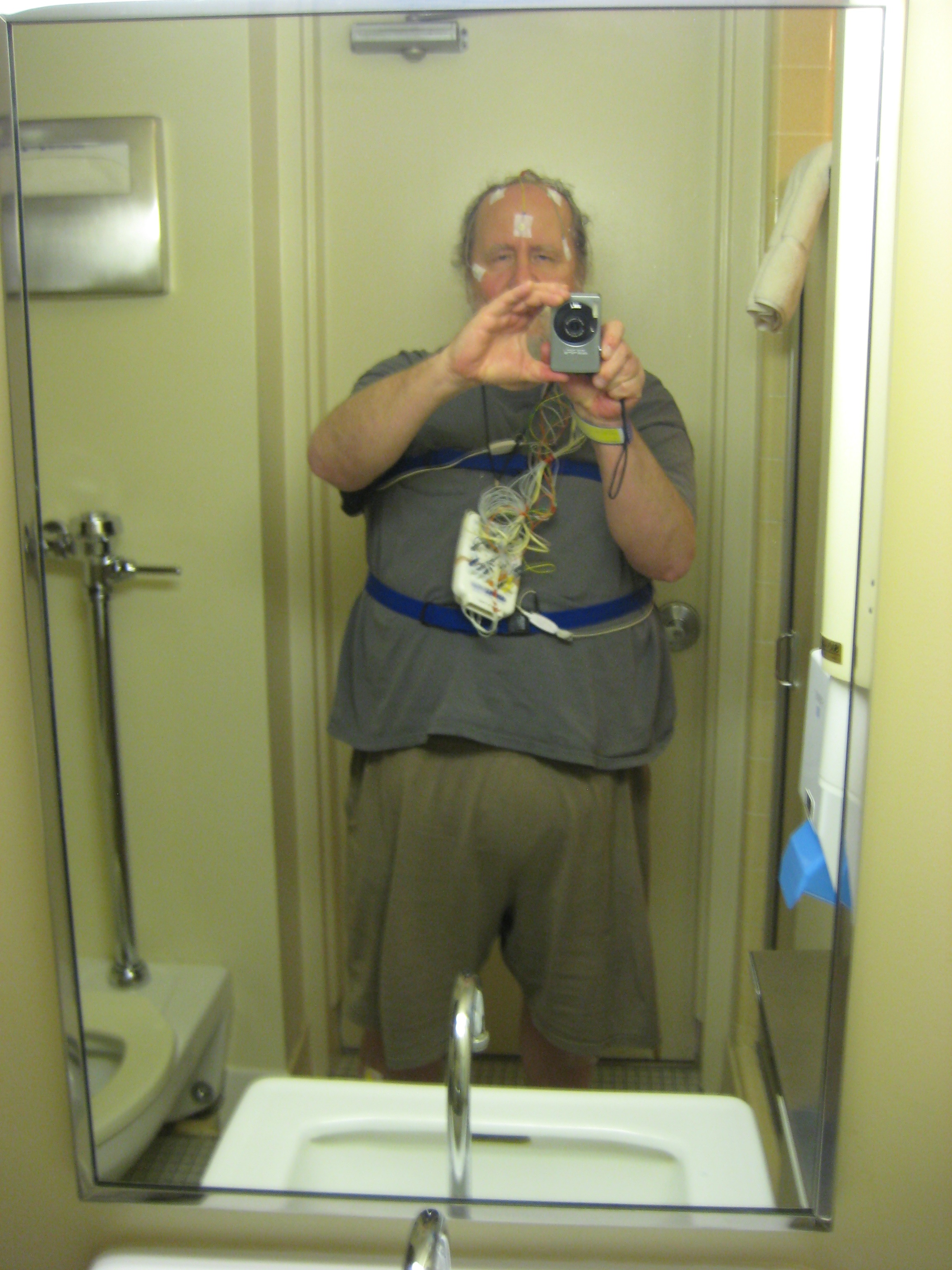 First image - at the sleep study that showed I have Sleep Apnea, not Lyme Disease. Clothes by “George” (WallMart). The wiring