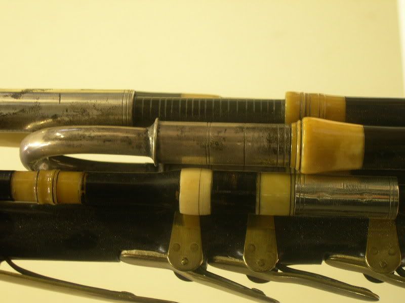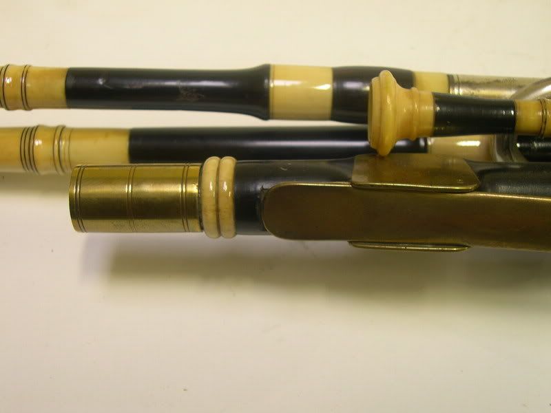 Another hint might be the drones´ material: Black wood (obviously Ebony) whereas the vast majority of those sets are made from brown wood. Was it an issue to obtain Ebony (long enough) in those days? Of course we know today that materials were expensive and manpower cheap and therefore all products (whatever) of those days were richer decorated, but I think that the people also had a higher respect for decorations anyway and knew more about their aesthetic meaning. In books on woodturning you can read that even members of the nobility had lathes and turned objects for their leasure.