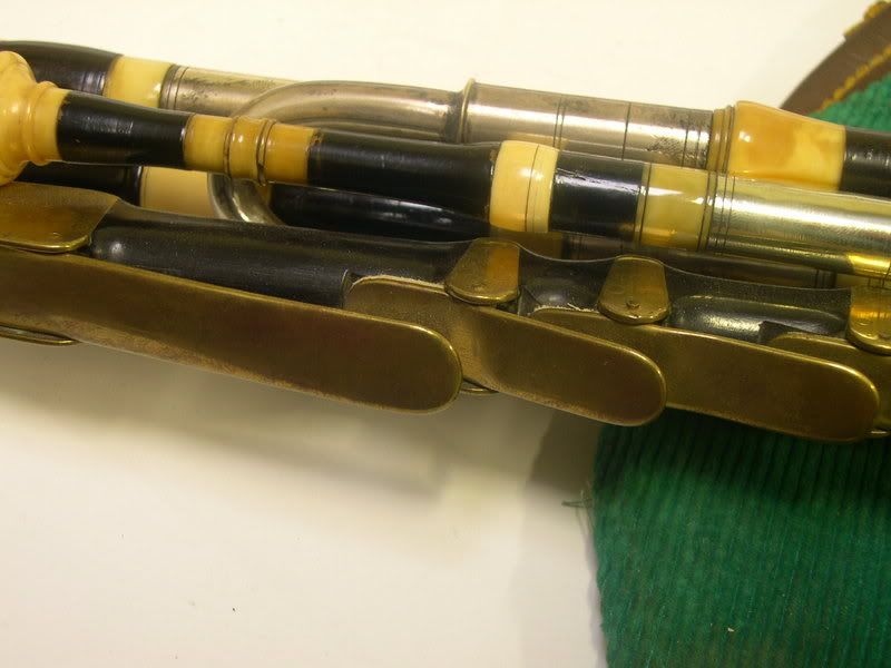 The chanter (and reg) are agreed upon to be non-original. The majority of these sets (of those days) had chanters without keys. Maybe the drones´ metal parts were plated to match the chanter?