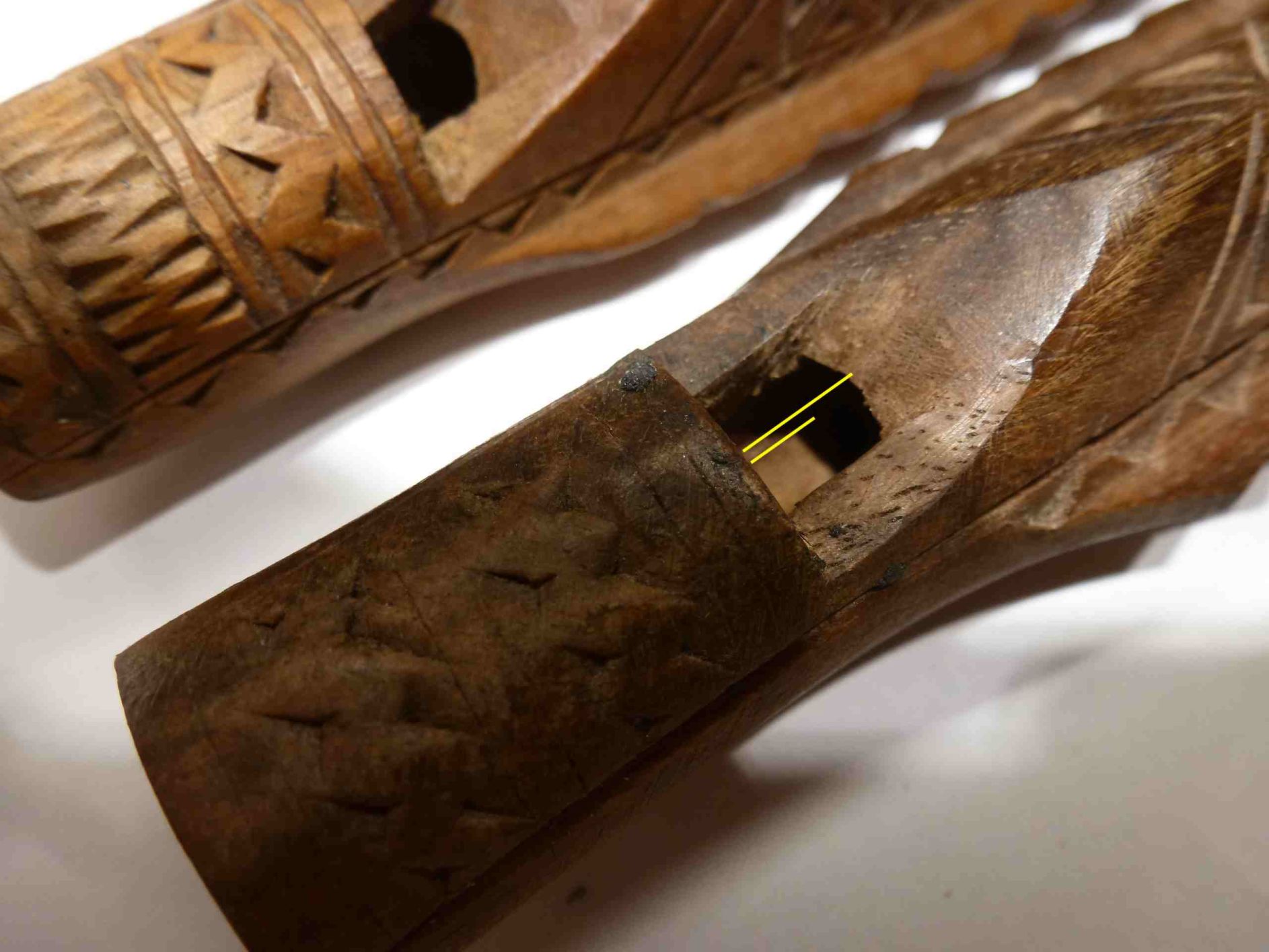 The other, similar but a bit shorter, doesn’t play at all. It looks similar, the lip looks OK, I replaced the plug and played with the airway size, but if anything made it worse. I cannot get a single note, not even a squeak.
